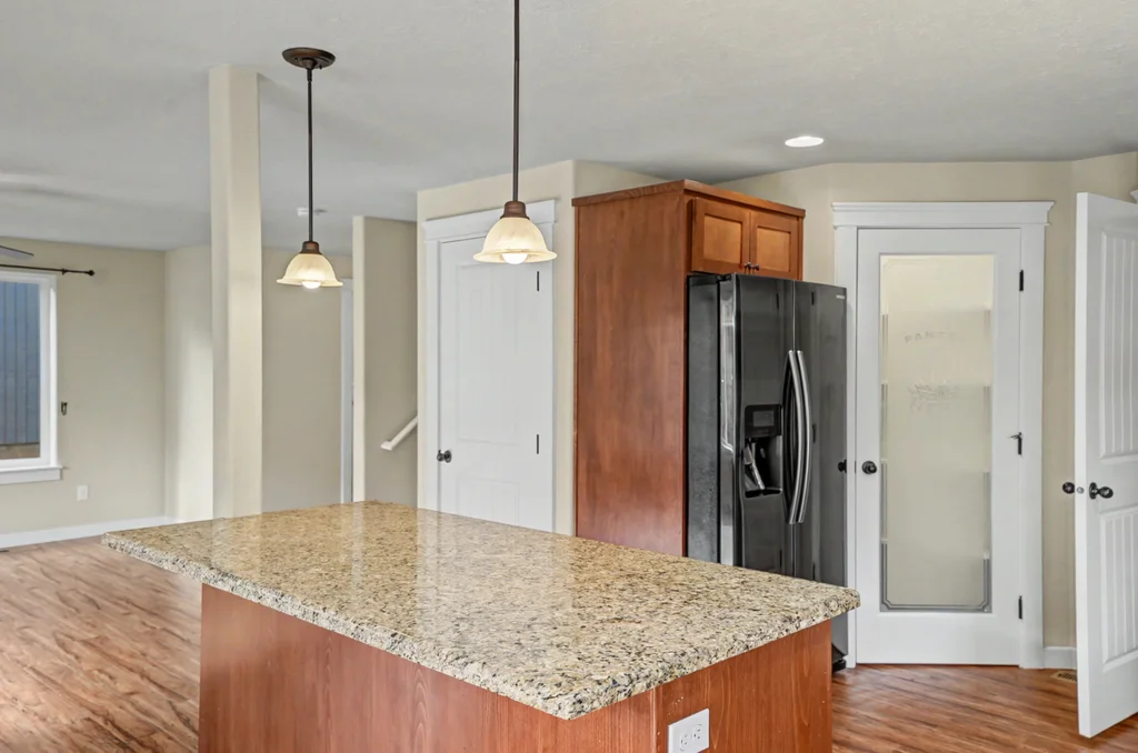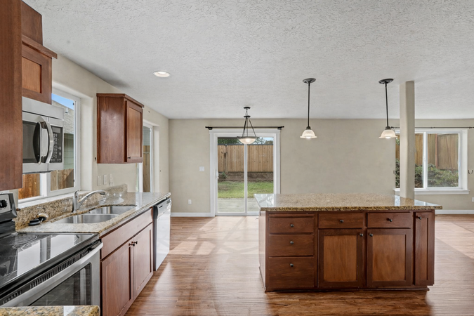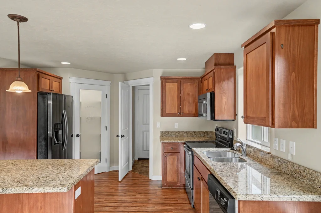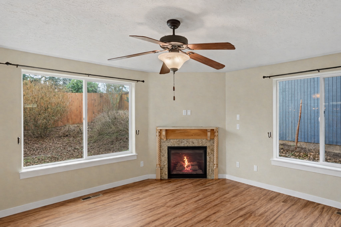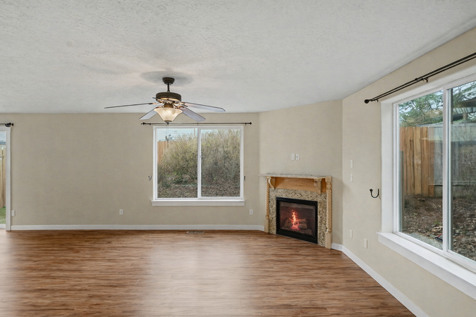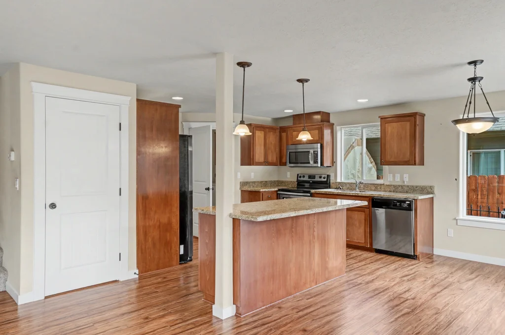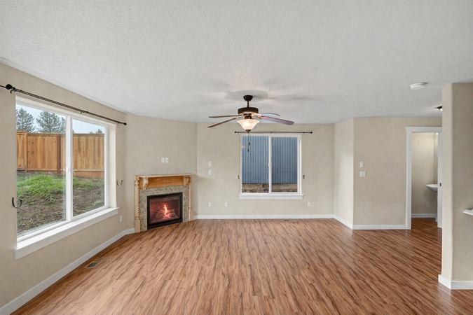 Well-designed 3 bedroom, 2.5 bathroom home with a 2-car garage and a functional layout. The kitchen features granite countertops, an island with eating bar, stainless steel appliances, and a pantry. Laminate flooring runs throughout the main level, complemented by a cozy gas fireplace in the living room. Upstairs includes 3 bedrooms, with a primary suite featuring vaulted ceilings and a large walk-in closet. An unfinished 18x17 bonus room is nearly complete but not included in the home’s square footage. All appliances, including the refrigerator, washer, and dryer, are included. Fenced backyard with underground sprinklers.
